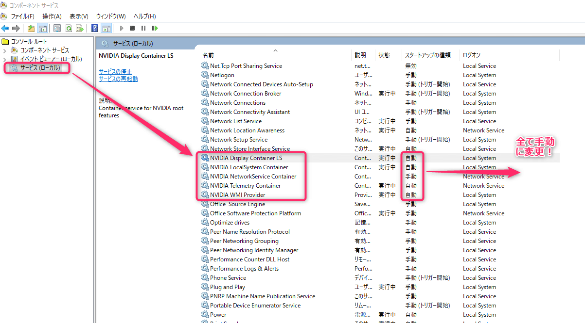 2. NVIDIAの項目までスクロールして、NVIDIAすべての項目をひとつひとつ選択し右クリック>プロパティ>スタートアップの種類>手動に変更
