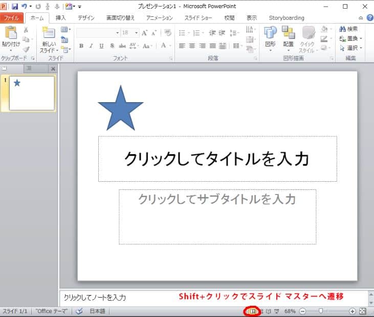 右下のウインドウアイコンをShift+クリックでスライド マスターへ移動します。