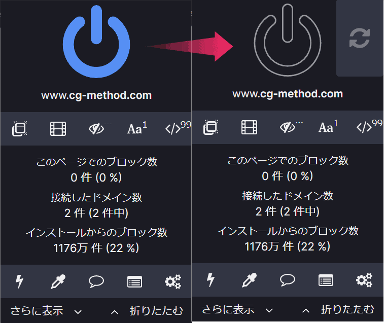 電源アイコンの場所をクリックしてOFFにすれば、サイト単位での広告ブロックをOFFにできます。