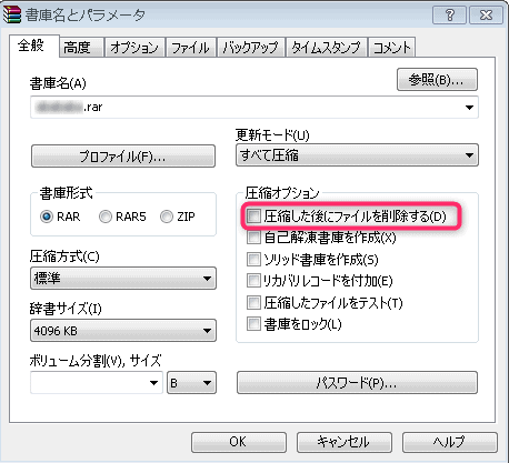 オプションが表示されるので、圧縮した後にファイルを削除するにチェックしましょう。