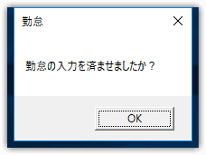 MyVar = MsgBox ("勤怠の入力を済ませましたか?", 0, "勤怠") あとは「スタートアップ」に入れておくだけです
