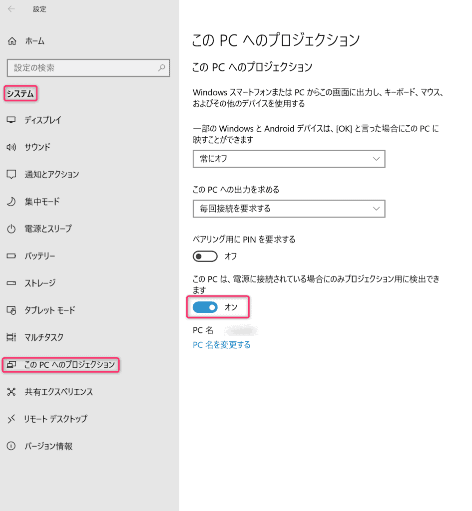 「このPCは、電源接続されている場合にのみプロジェクション用に検出できます」をオンにします。
