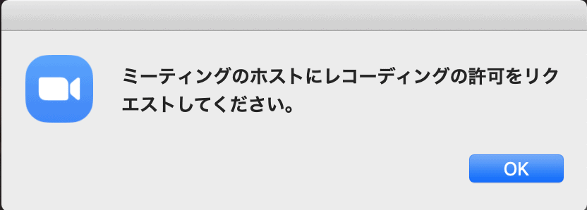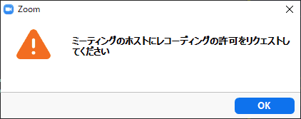しかし「ミーティングのホストにレコーディングの許可をリクエストしてください。」とダイアログが出てきて、レコーディングできない場合があります。