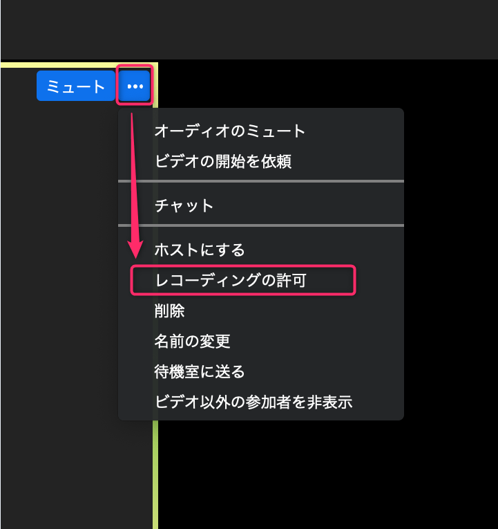 やり方は簡単で、ミーティングを開いたホストが、対象者のサムネイル右上のスリードットメニューをクリックして、「レコーディングの許可」をクリックするだけです。