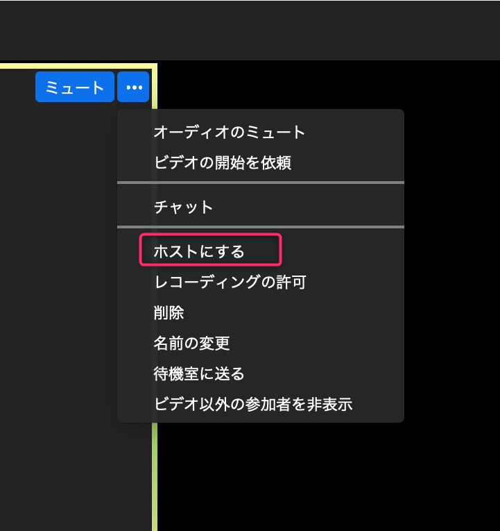 ホスト複数人にレコーディングの許可を与えるのが面倒などの場合は同じくサムネイルをクリックして「ホストにする」を選んで、ホストをやってくれる方に委任しても良いと思います。