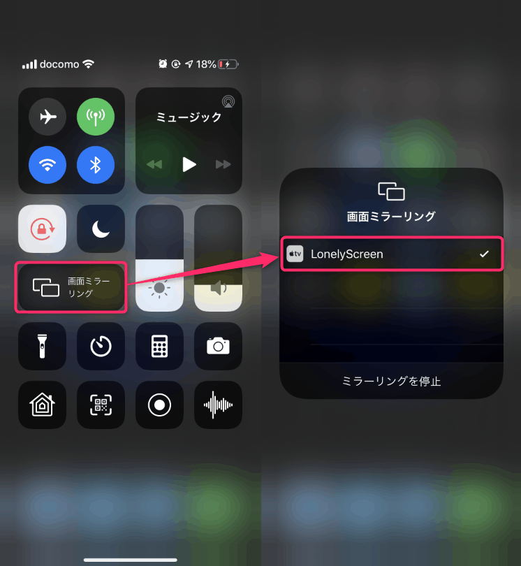 iPhoneの右上から下に向かってスライドするとメニューが出ると思いますが、画面ミラーリング>LonelyScreenを選ぶと、さきほどのPCの「LonelyScreen」にスマホの画面が映ります!