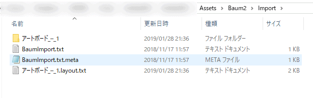 - Assets>Baum2>Importに出力したデータを格納(画像フォルダと○○.layout.txt)※ついでのFontsフォルダにフォントも入れておく